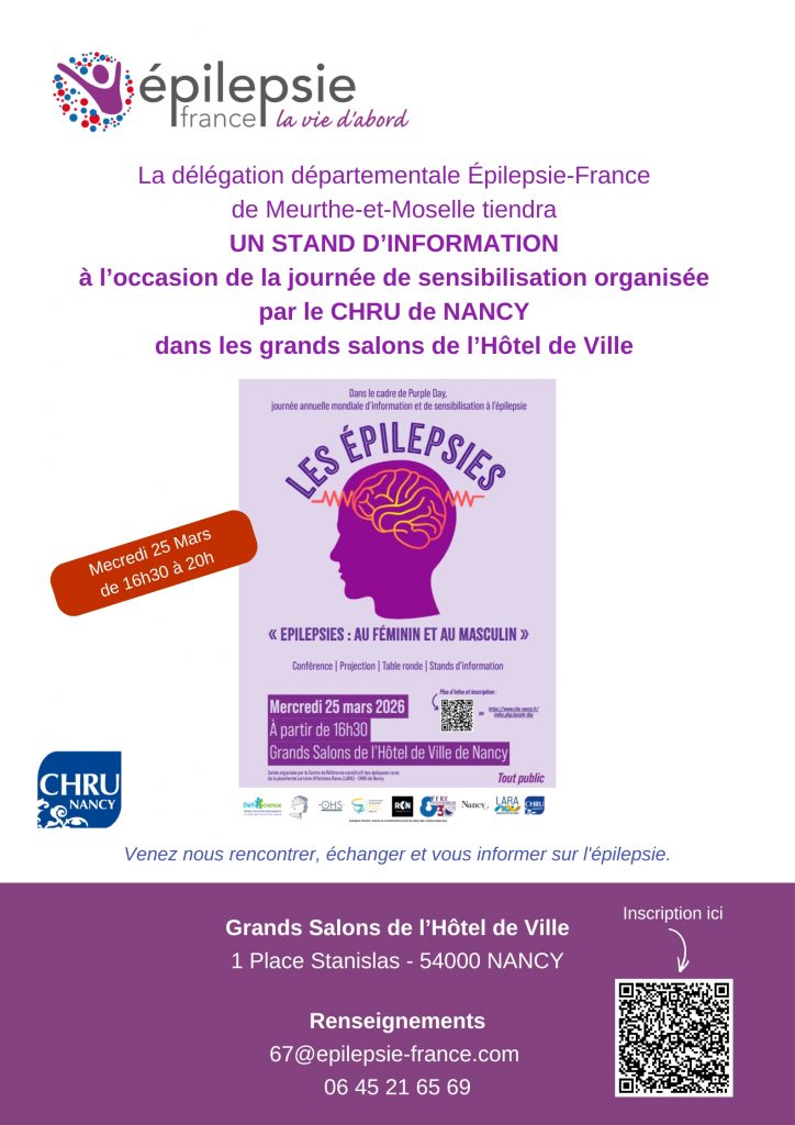 La délégation départementale Épilepsie-France de Meurthe-et-Moselle tiendra UN STAND D’INFORMATION dans les Grands Salons de l’Hôtel de Ville de Nancy, à l’occasion de la journée de sensibilisation « Les épilepsies » organisée par le CHRU de Nancy, Mercredi 25 Mars de 16h30 à 20h. Venez nous rencontrer, échanger et vous informer sur l’épilepsie. Grands Salons […]