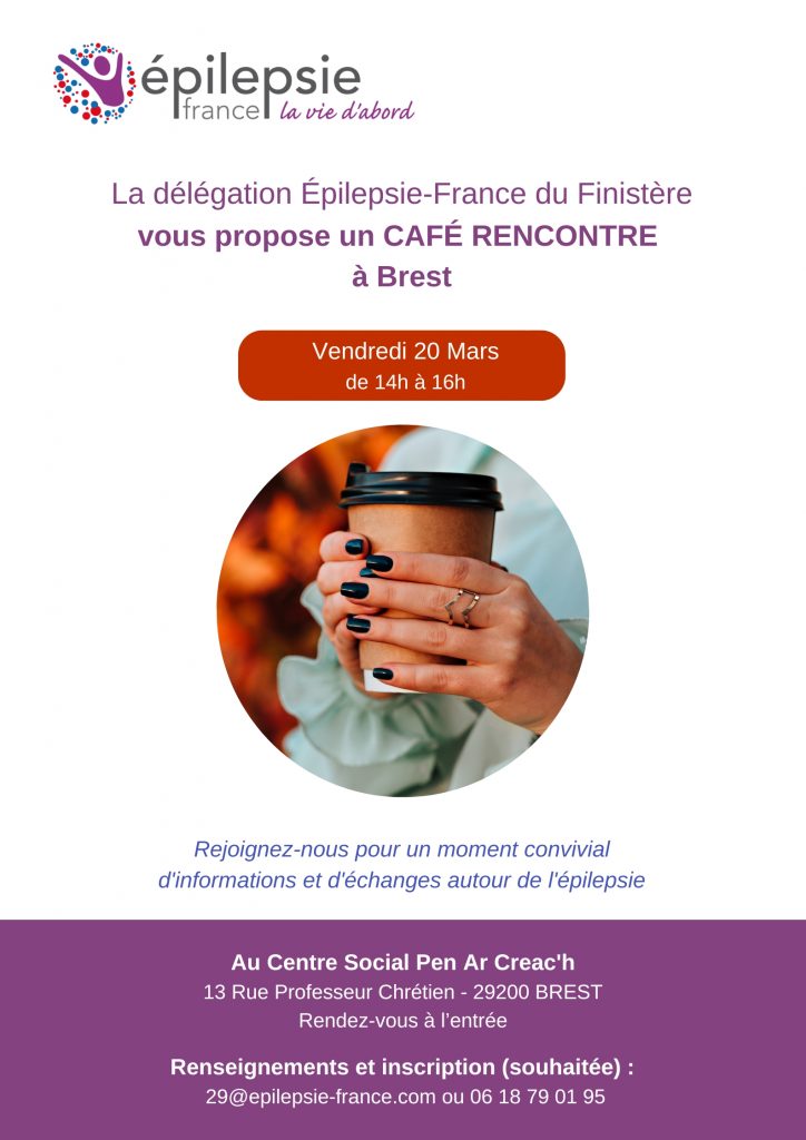 La délégation Épilepsie-France du Finistère vous propose un CAFÉ RENCONTRE à Brest, Vendredi 20 Mars de 14h à 16h. Rejoignez-nous pour un moment convivial d’informations et d’échanges autour de l’épilepsie. Au Centre Social Pen Ar Creac’h 13 Rue Professeur Chrétien – 29200 BREST Rendez-vous à l’entrée Renseignements et inscription (souhaitée) : 29@epilepsie-france.com ou 06 18 79 01 95 Épilepsie France […]
