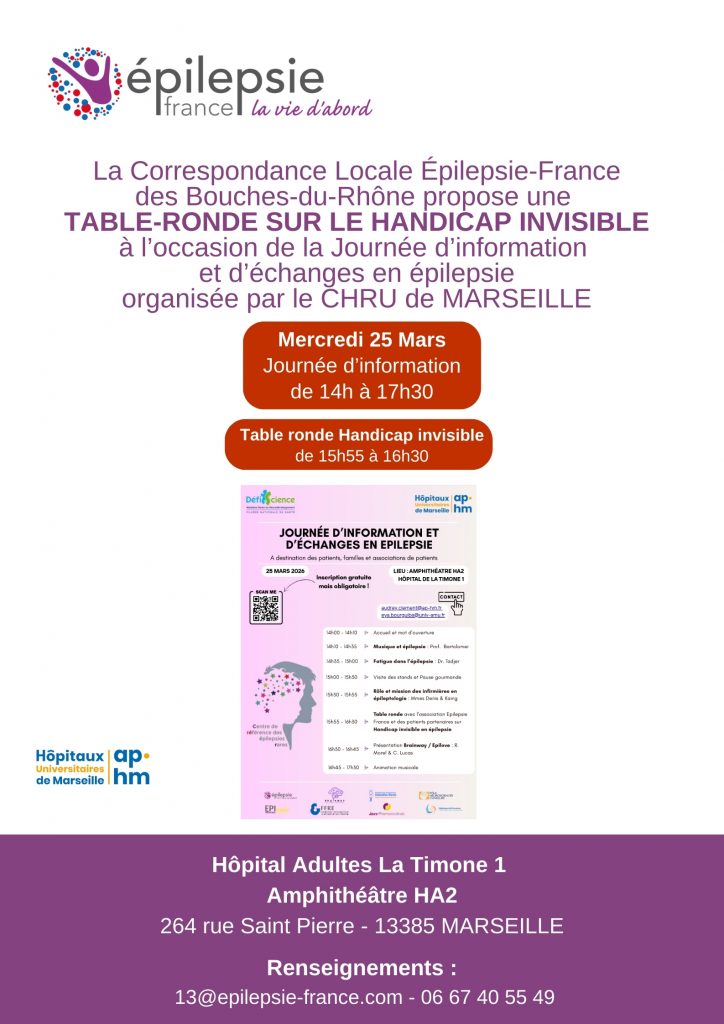 La Correspondance Locale Épilepsie-France des Bouches-du-Rhône participera à une TABLE RONDE sur le Handicap invisible (de 15h55 à 16h30) à l’occasion de la Journée d’information et d’échanges en épilepsie organisée par les Hôpitaux Universitaires de Marseille (Hôpital de La Timone), Mercredi 25 Mars. Hôpital de La Timone 1 Amphithéâtre HA2 264 rue Saint Pierre […]