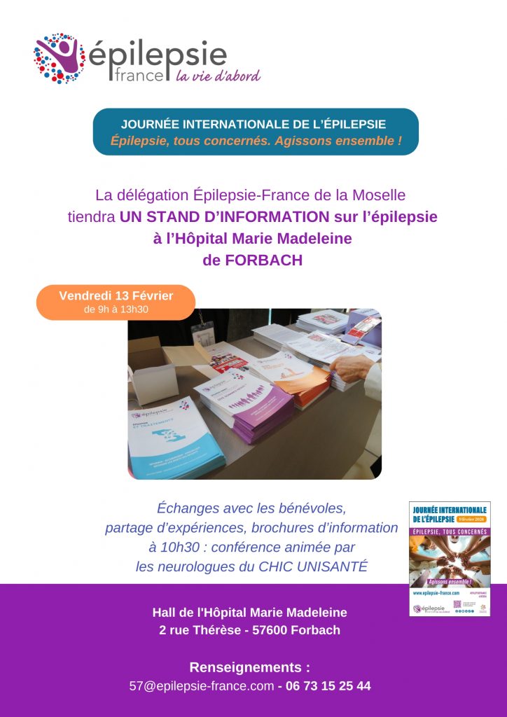 À l’occasion de la Journée Internationale de l’Épilepsie, la Délégation départementale Épilepsie-France de la Moselle tiendra UN STAND D’INFORMATION SUR L’ÉPILEPSIE dans le hall de l’hôpital Marie-Madeleine de Forbach, Vendredi 13 février de 9h à 13h30.