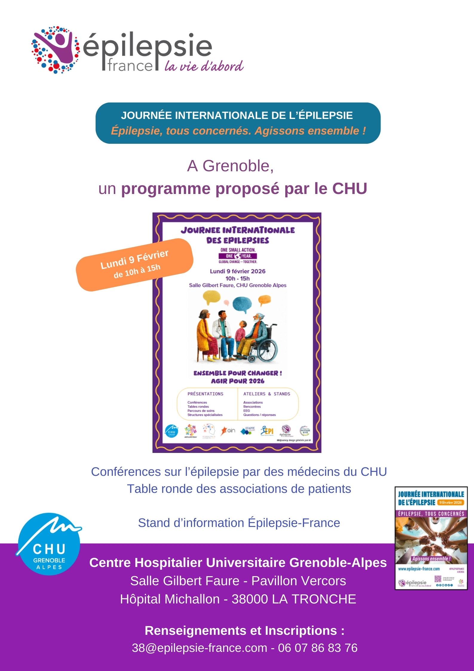 A l’occasion de la Journée Internationale de l’Épilepsie 2026, le Centre Hospitalier Universitaire Grenoble-Alpes organise une journée d’information sur l’épilepsie, Lundi 9 Février.de 10h à 15h.