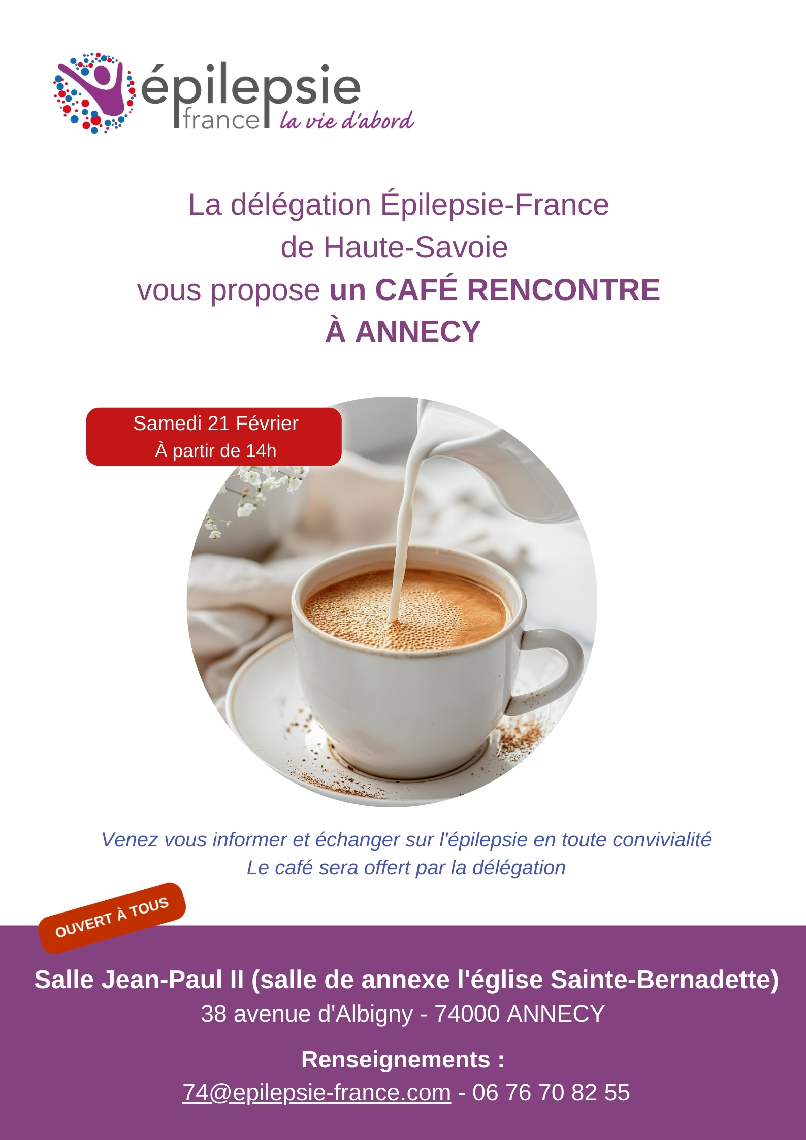 La délégation Épilepsie-France de Haute-Savoie vous propose un CAFÉ RENCONTRE à ANNECY, Samedi 21 Février À partir de 14h. Venez vous informer et échanger