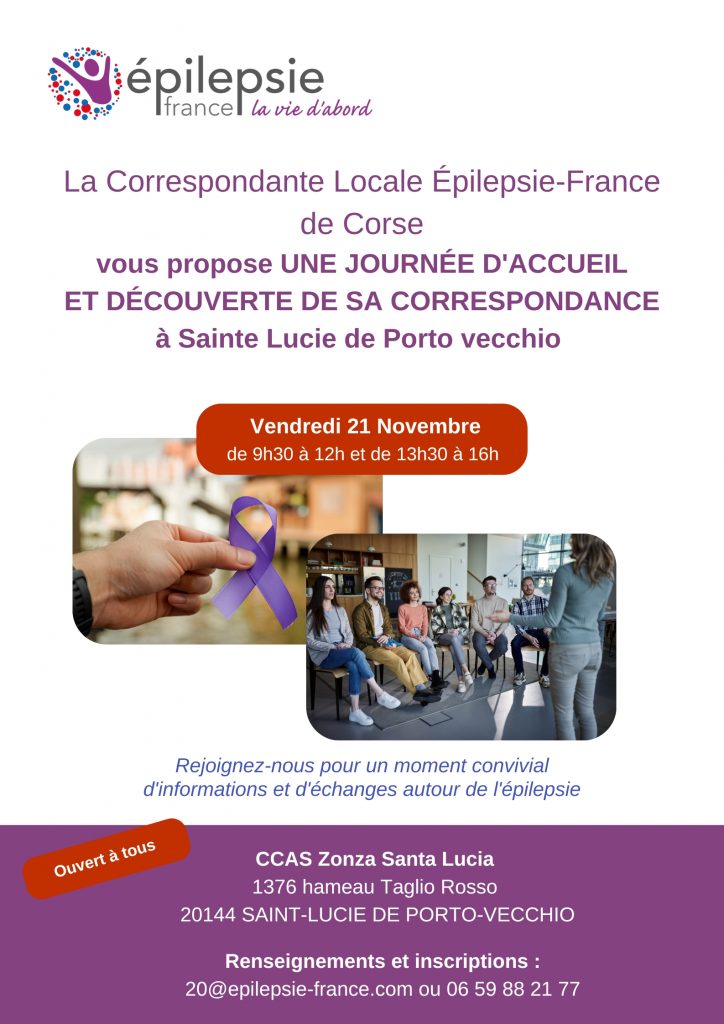 La Correspondante Locale Épilepsie-France de Corse vous propose une journée d’accueil et découverte de sa correspondance. Elle se tiendra dans les locaux du CCAS, Vendredi 21 Novembre de 9h30 à 12h et de 13h30 à 16h.