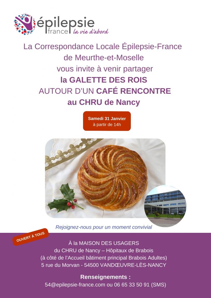 La Correspondance Locale Épilepsie-France de Meurthe-et-Moselle vous invite à venir partager la GALETTE DES ROIS autour d’un Café Rencontre au CHRU de Nancy, Samedi 31 Janvier à partir de 14h.